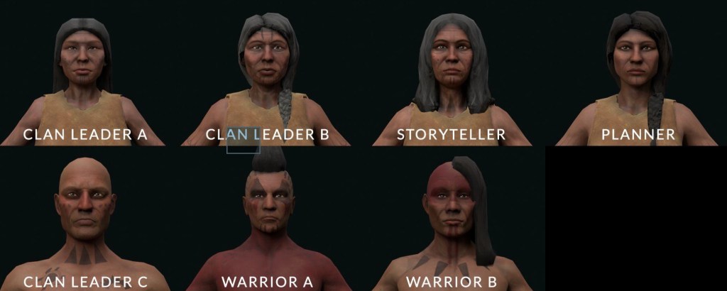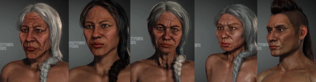 Longhouse 6.0 builds directly on the work from Longhouse 5.0 by bringing high-fidelity characters back into focus. In the previous version, the Awastokì team created seven adult characters. Quite a bit of research went into developing the hairstyles, tattoos, clothing, and accessories. However, given the numbers of people in the village, the final non-player characters (NPCs) had to stay below a 15 polygon count. Higher level details relied heavily on normal maps. As you can imagine, this really reduced the overall quality of the experience.