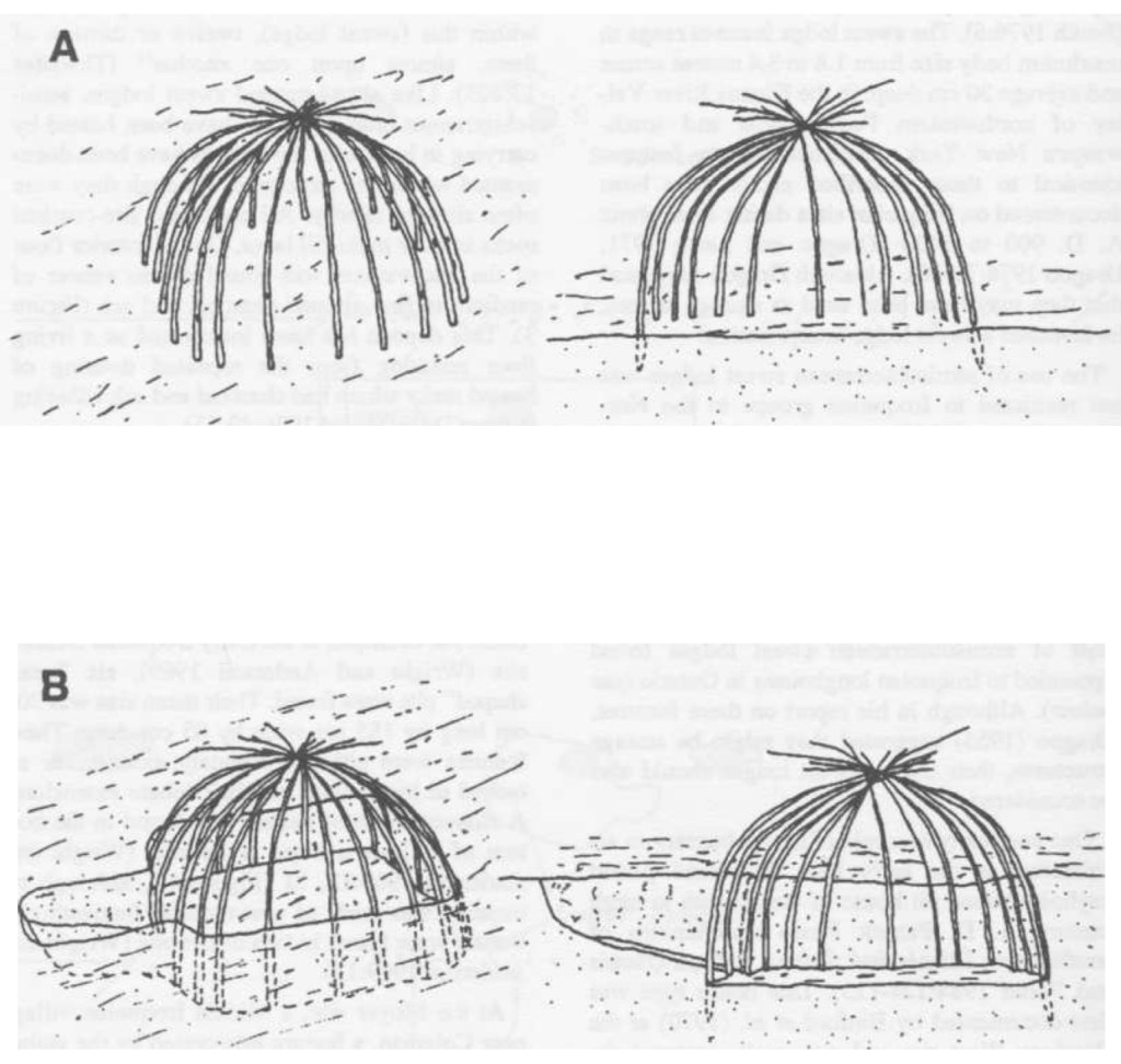 Semisubterranean Lodges (SSLs): Often rectangular (approx. 2×3 meters), dug about 60 cm deep, sometimes with ramped entrances, and covered by superstructures of poles, bark, or hides (MacDonald, 1988 ). Floors could be heavily charred. These features are often characterized by a distinctive “keyhole” or “turtle pit” shape.